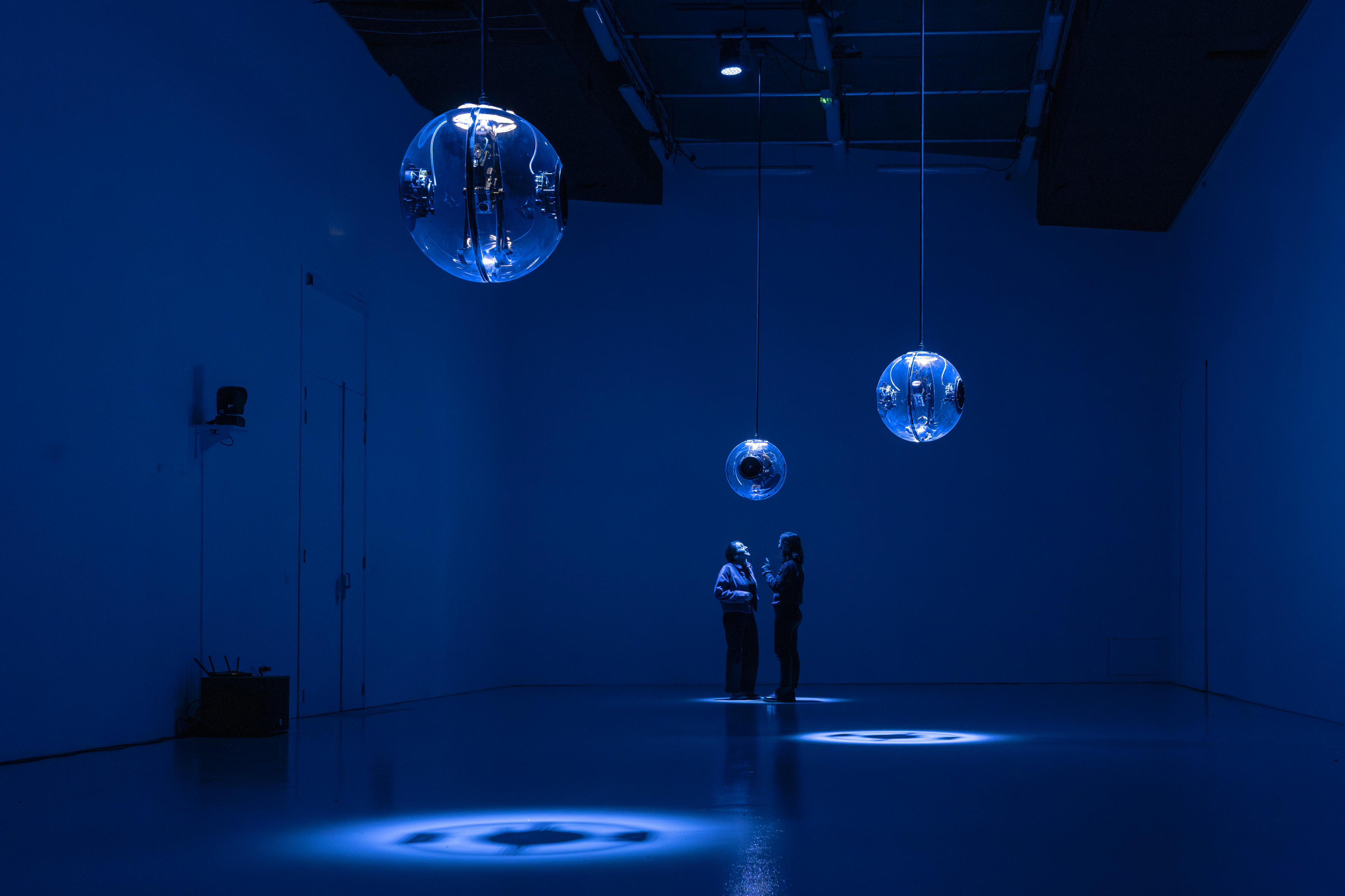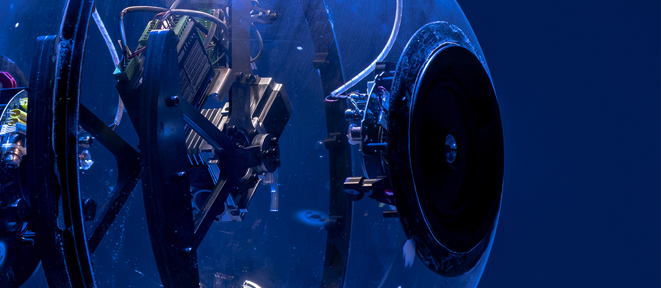 In the weight of gravity, the large spheres appear with the strangeness of animal-like robotics, engaging our physical and emotional perceptions. Their hypnotic movements reveal the paradoxes of the finite and the infinite, as well as the wave-particle duality.