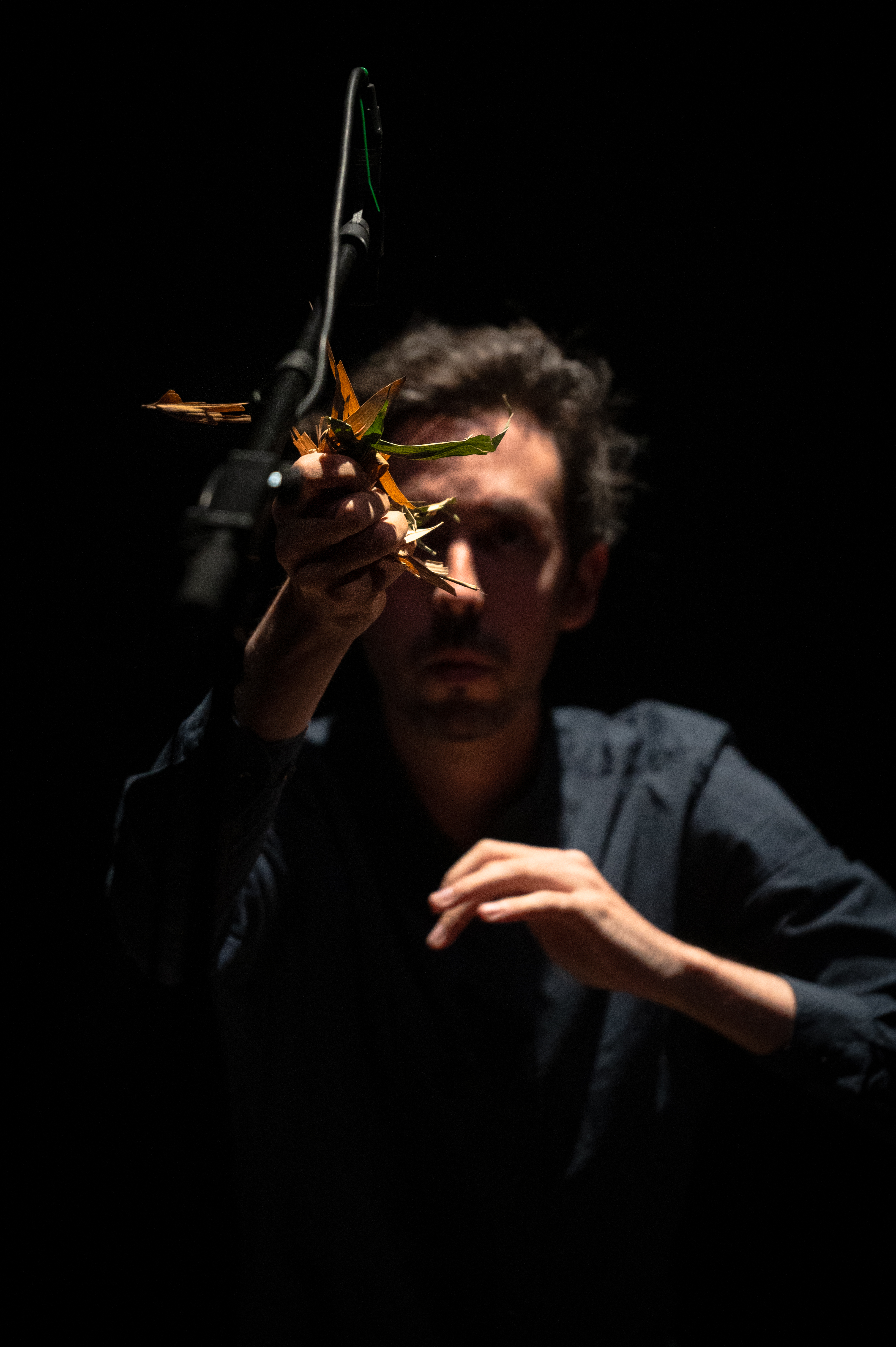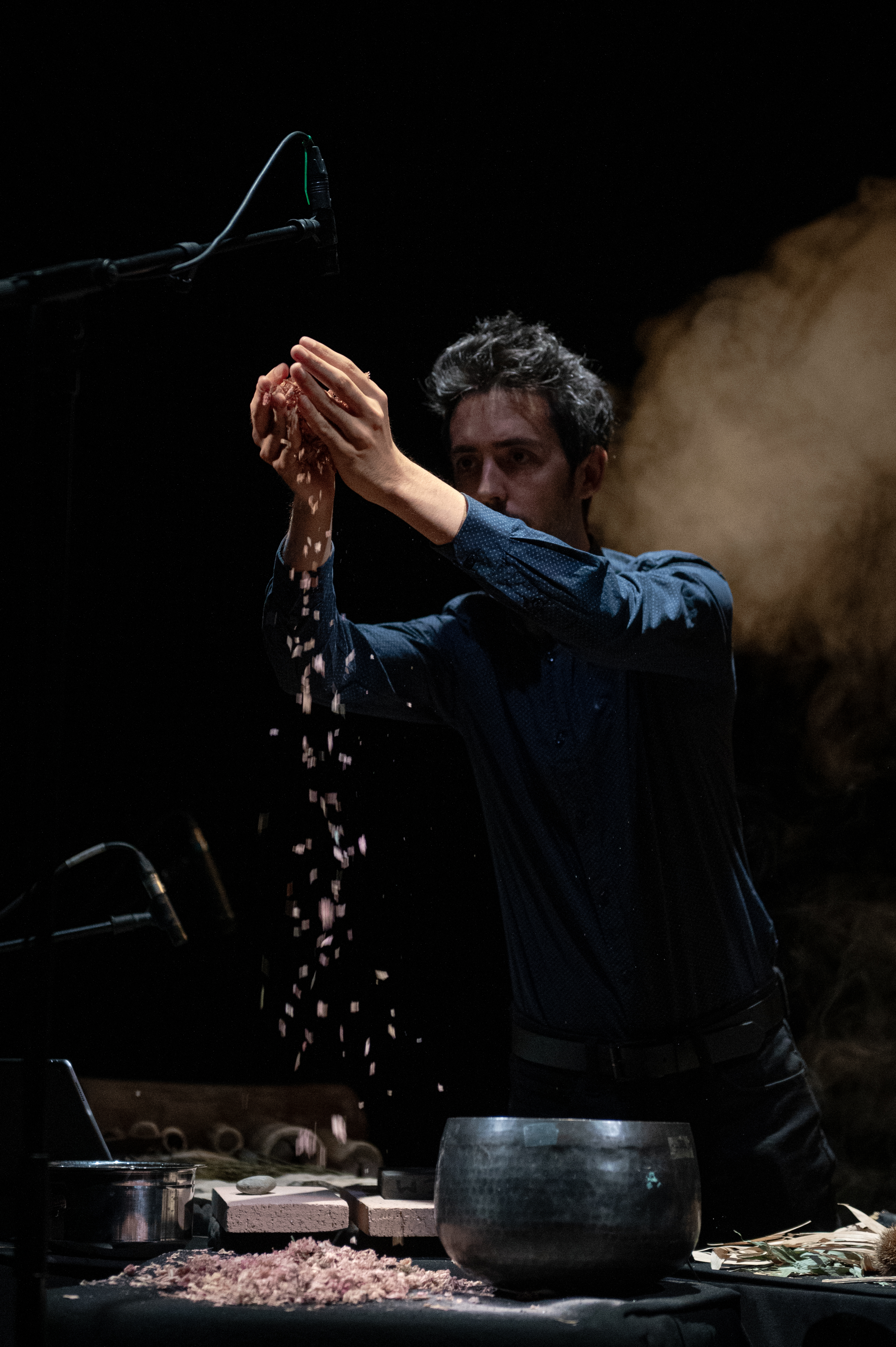 The percussionist of Musica povera acts as a master of ceremonies; he handles flowers and bark, strikes stones to make them ring, and taps on metal and pieces of wood. From these materials and these gestures emerge sounds that are then slightly transformed through a special microphonic technique—sounds that are half concrete, half electronic, gradually organizing themselves into music composed of polyrhythms.