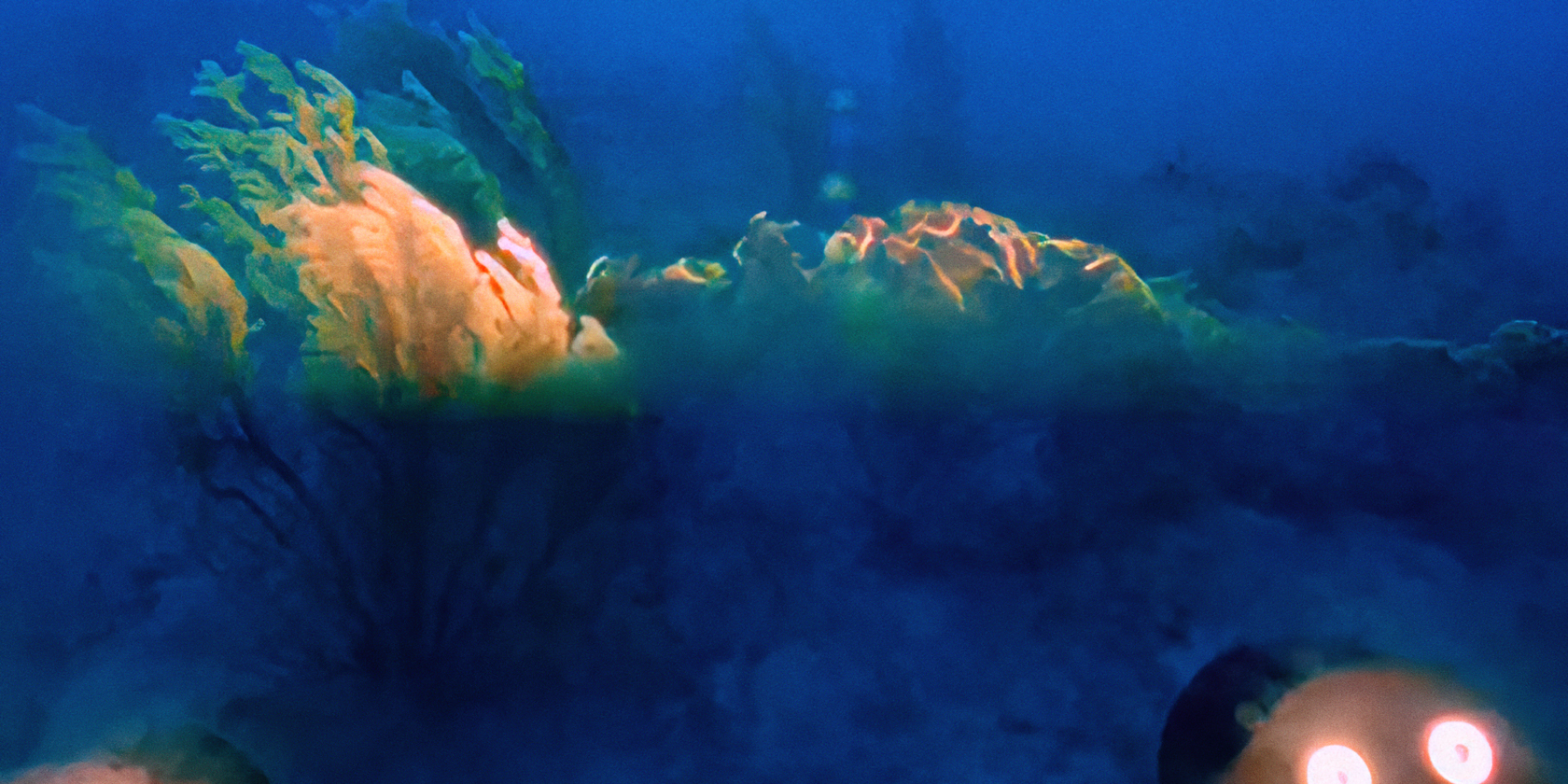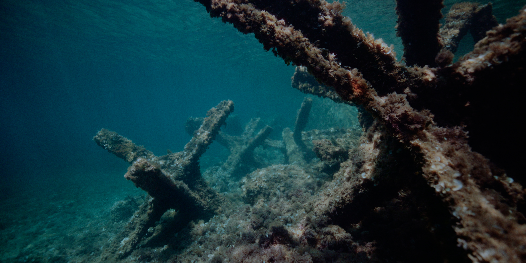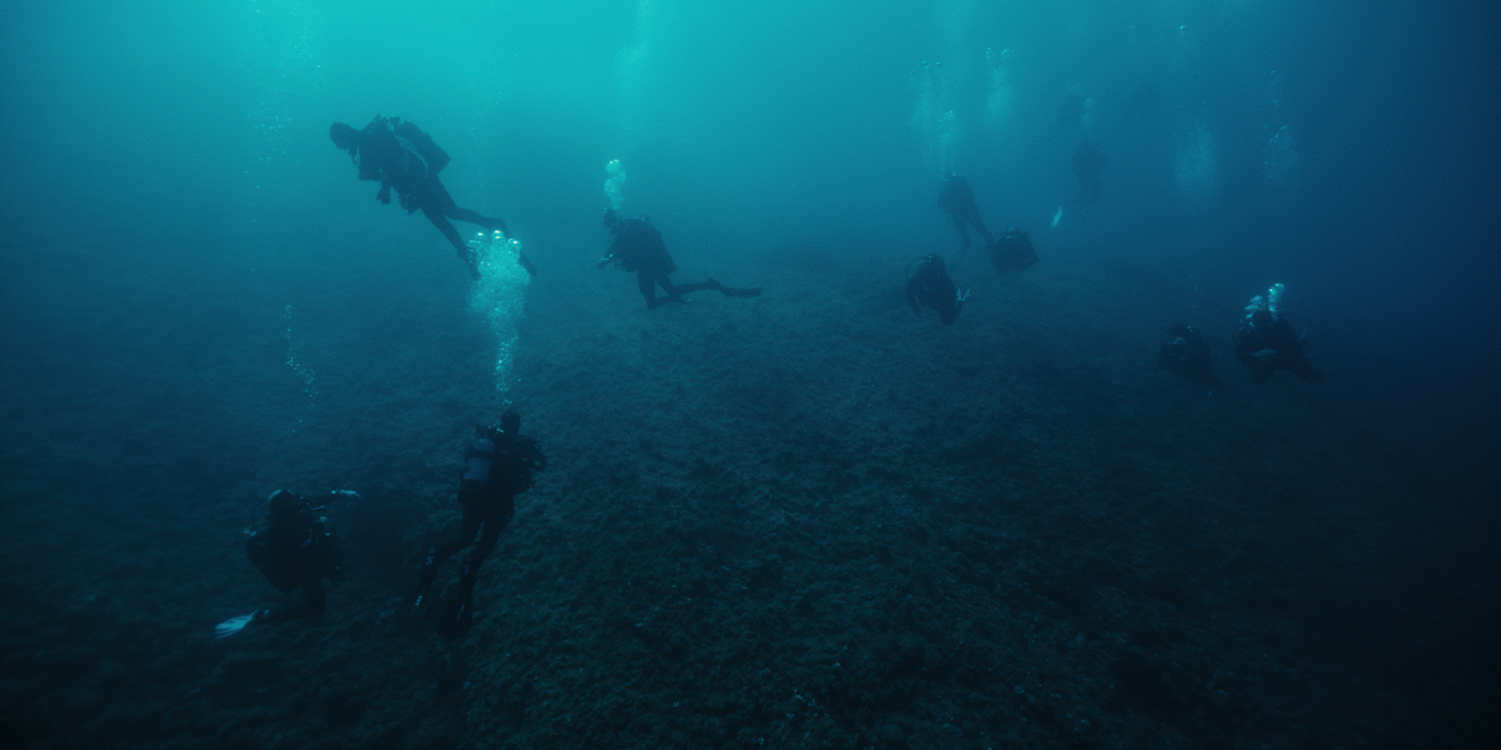 Beneath the Mediterranean horizon, a changing world is revealed, fragile and resilient, untouchable and irreversibly transformed. In the depths, marine life and human presence intertwine: cargo ships rumble on the surface, cables and pipelines run along the seabed, fishing nets clog vast expanses of water, and strange divers strive to repair the damage.