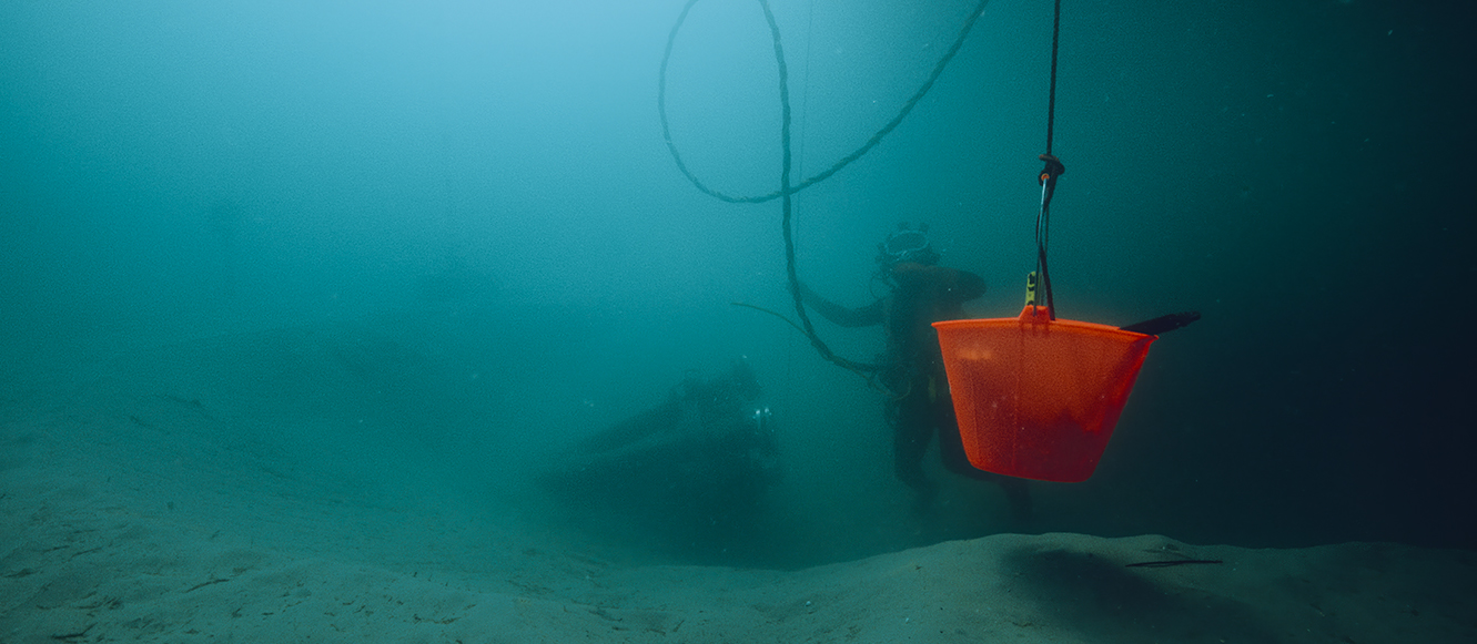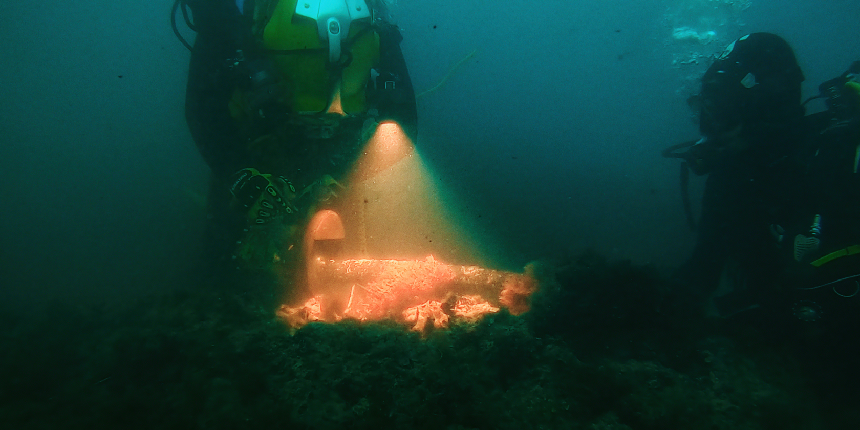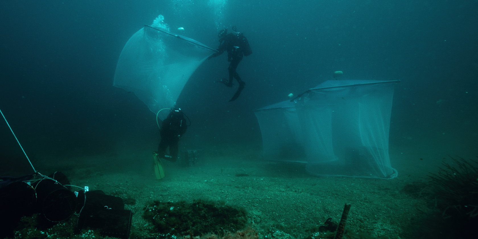 Beneath the Mediterranean horizon, a changing world is revealed, fragile and resilient, untouchable and irreversibly transformed. In the depths, marine life and human presence intertwine: cargo ships rumble on the surface, cables and pipelines run along the seabed, fishing nets clog vast expanses of water, and strange divers strive to repair the damage.